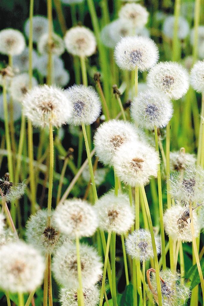 一天,我无意中看到,被踩踏的残枝旁,不少蒲公英的顶端,结出了一个个团状的白色绒球,似柳絮,如棉花,中空滚圆,十分有趣,这便是成熟了的蒲公英的种子了。见状,我信手采了一支,鼓圆了腮帮子用力一吹,一个个小“降落伞”携着种子,随风飘去,越飞越高。此情此景,唤起了我童年的记忆。