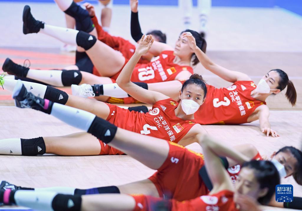 7月14日,中国队球员在比赛前热身。新华社记者 沙达提 摄
