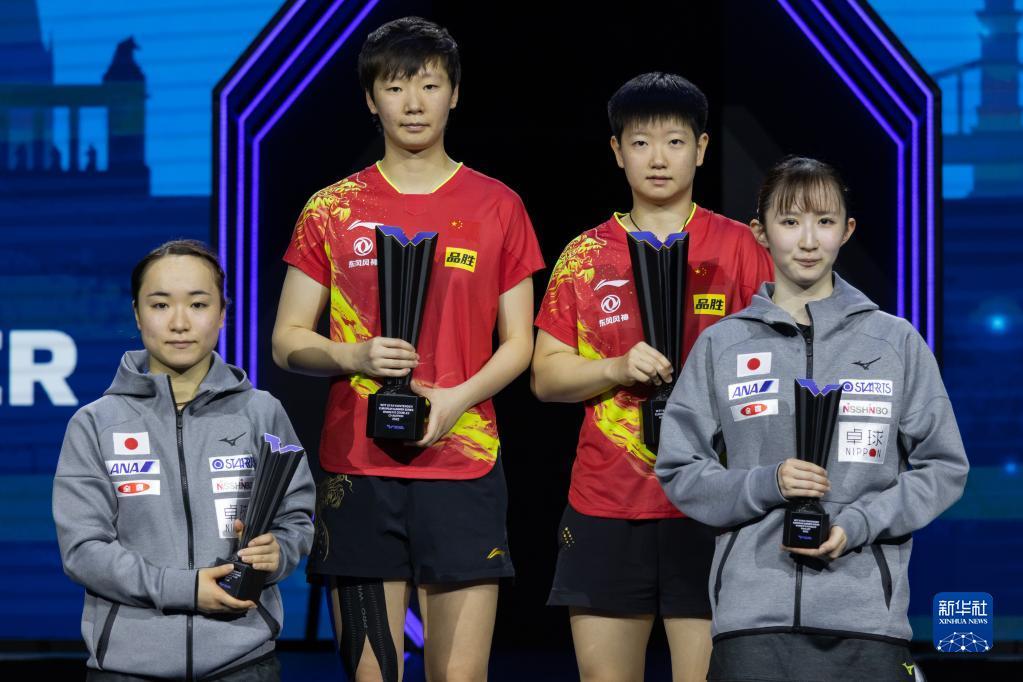 7月17日,孙颖莎(右)/王曼昱在颁奖仪式上。新华社发(弗尔季·奥蒂洛摄)