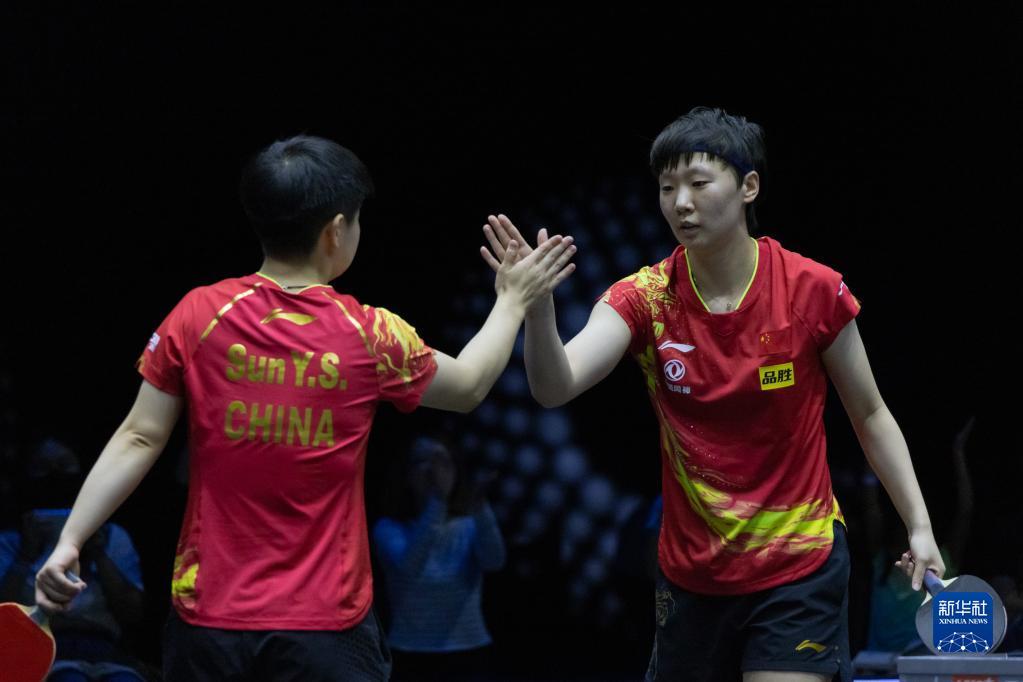 7月17日,孙颖莎/王曼昱(右)庆祝胜利。新华社发(弗尔季·奥蒂洛摄)