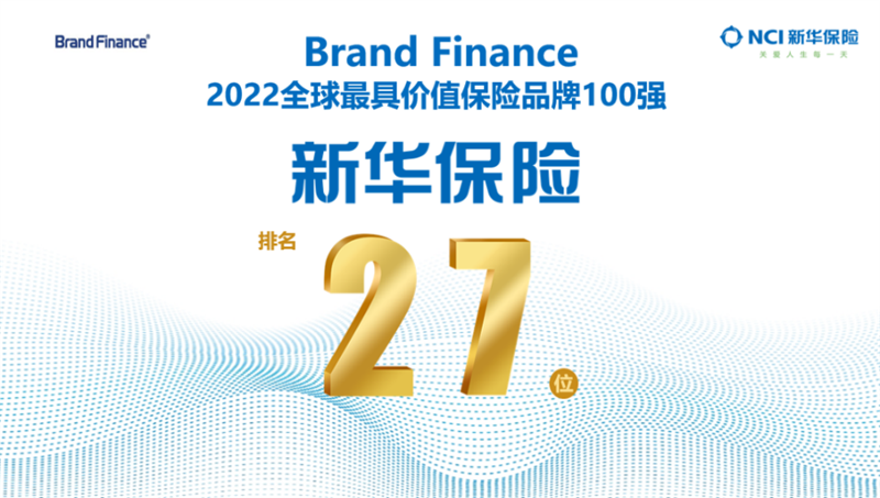 5月,国际知名品牌咨询公司“品牌金融”(Brand Finance)发布“2022全球最具价值保险品牌100强”排行榜(Insurance 100 2022),新华保险再次登榜,位列第27位,较2021年上升4位,连续第八年进入该榜单前50强。