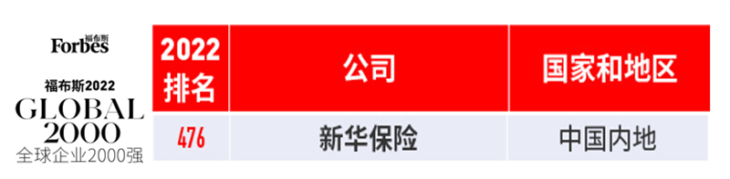 5月12日,美国《福布斯》杂志发布2022年度“全球上市公司2000强”榜单。新华保险连续第九年进入榜单前500强。榜单期内,公司营收344亿美元,利润23亿美元,资产1764亿美元,居榜单第476位,在进入榜单的中国内地保险公司中排名第4。