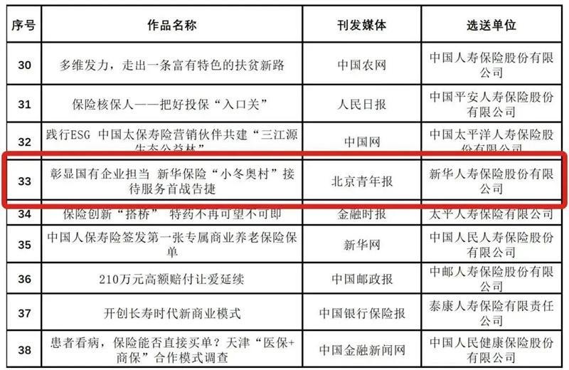 新华人寿保险股份有限公司2021年10月发布的新闻《彰显国有企业担当 新华保险“小冬奥村”接待服务首战告捷》荣登“中国保险业2021年度好新闻”。