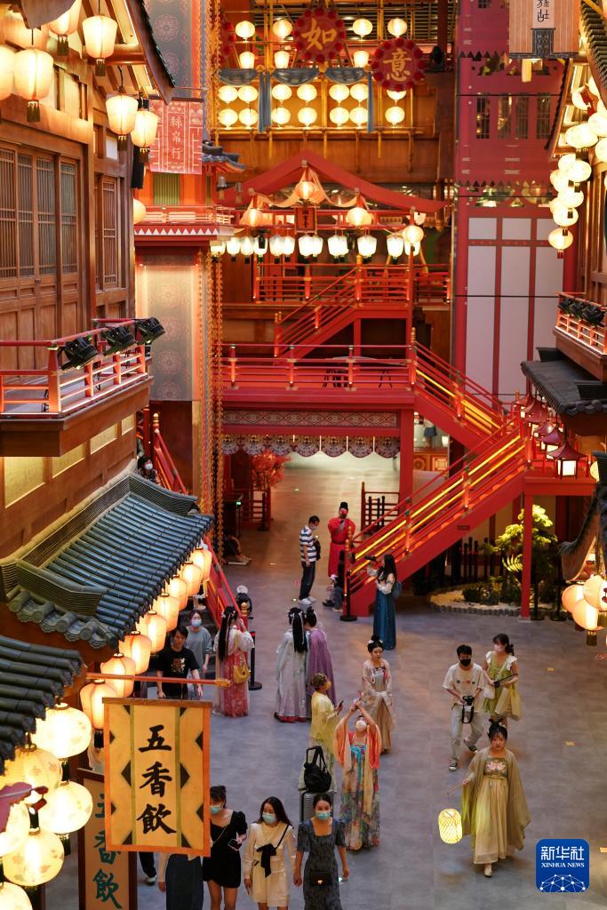 游客在西安曲江新区内的长安十二时辰主题街区内游览(5月19日摄)。