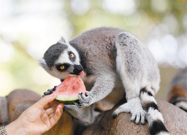 另一边,来自马达加斯加的“太阳使者”——环尾狐猴们,看到饲养员端着一盘西瓜,纷纷翘起漂亮的尾巴。不等饲养员将西瓜“落定”,性急的已经迫不及待地用小爪子捧一块西瓜啃了起来。其间,也有呆萌的“懒汉”蹲在石头上不愿意动,等饲养员或“领养”自己的小主人拿西瓜去喂它。