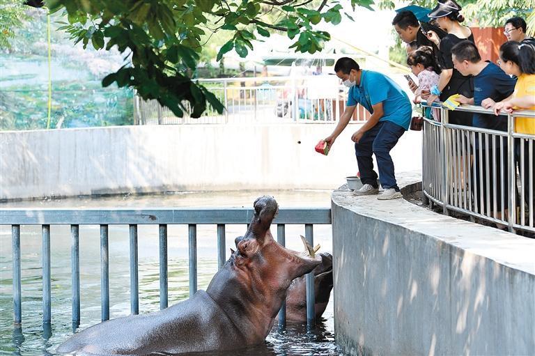 在河马、羚牛和大象活动区域,记者看到园方安装的喷淋设施已经开启,现场水雾缭绕洒出一片清凉。笨重的河马妈妈带着河马宝宝正在“专属”泳池里和游客们“躲猫猫”,水面上只露出一个黑色的背。互动中,它们有时会露出半个头,等游人凑近,又马上“害羞”地埋头钻进水中。