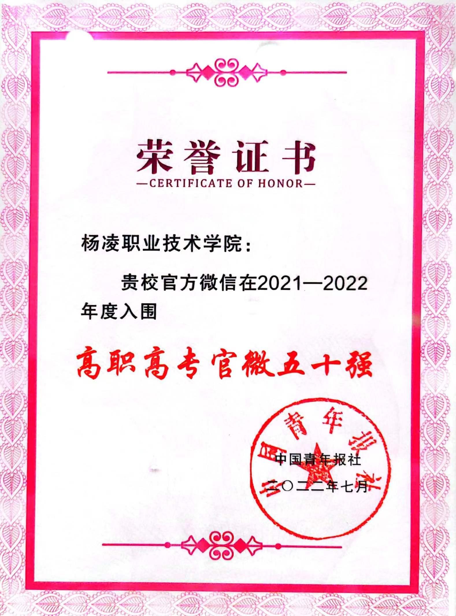 8月9日,中国青年报“青春元宇宙助力高校大思政”研讨会暨校媒精英汇在山东青岛召开。会上公布了“2021—2022年度中国大学官微百强”名单,杨凌职业技术学院官微排名第25位,再次进入全国高校官微50强行列,影响力指数持续上升。
