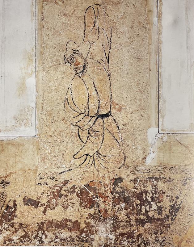 《乐舞图》原壁画揭取时被分割成为3幅。左右两幅是乐师图,中间为舞者图。
