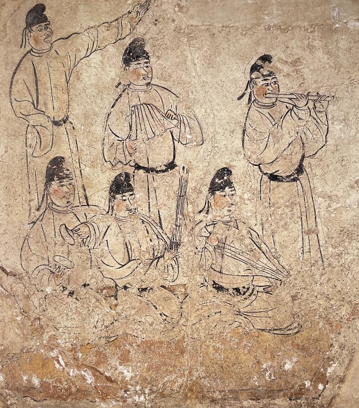 大唐盛世,音乐歌舞大行于天下。出土于唐代苏思勖墓中的《乐舞图》是描绘胡汉乐舞交织的壁画,画中汉人乐师用不同种类的胡汉民族乐器奏起欢快的胡腾舞曲,胡人舞师随之跳着奔放的胡腾舞。