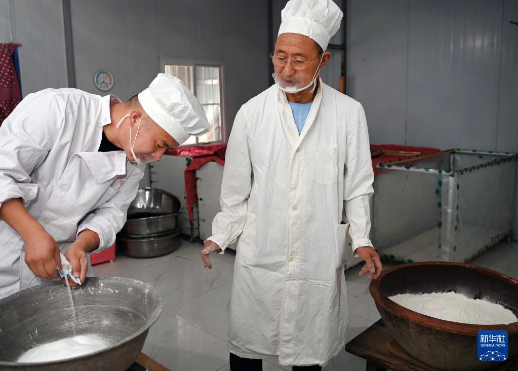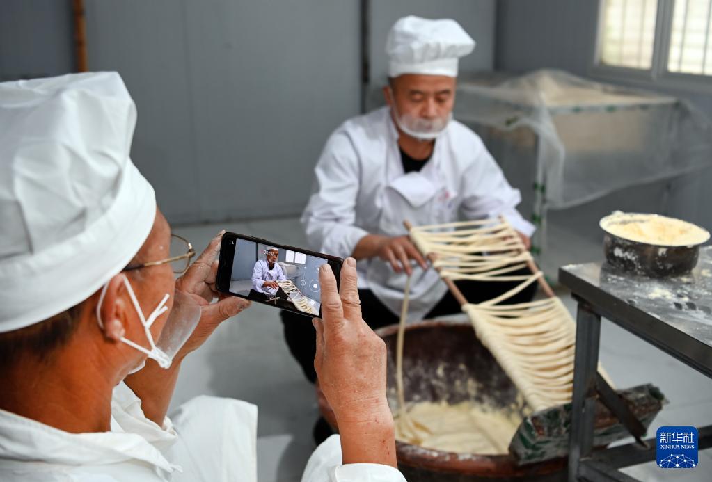 8月16日,父亲李长满(左)在向儿子李念平口手相传空心挂面的“缠筷子”工序。
