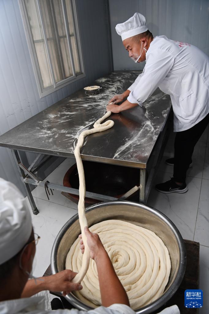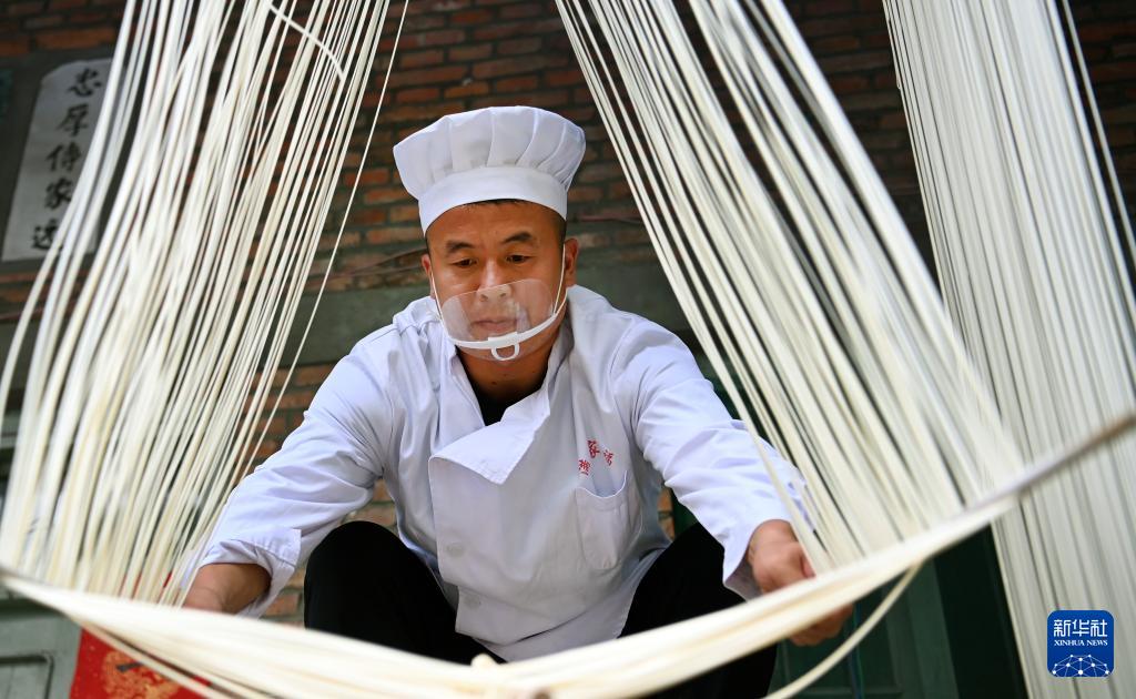 8月16日,李长满的儿子李念平在晾晒空心挂面。从小帮助父亲制作挂面的李念平,耳濡目染中掌握了制作空心挂面的技艺。