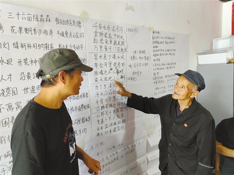78岁的泥河沟村村民武岳林(右)发表自己对村歌歌词的意见。 记者 霍海澎摄