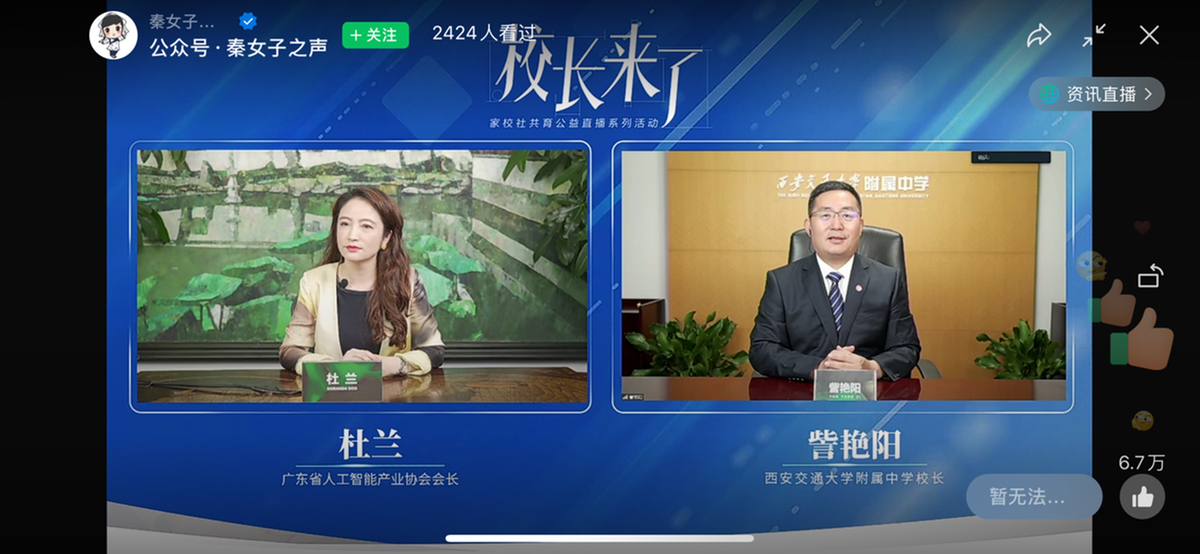 8月23日晚8点,“家校社共育公益直播系列活动”第九期“校长来了——给孩子成长支招”开播,这一次,活动从广东走向陕西,西安交通大学附属中学(下文简称“西安交大附中”)校长訾艳阳作客直播间,与广东省人工智能产业协会会长杜兰连线畅谈“高校需要怎样的人才”“青春期的孩子应该怎么教”等教育热点话题。
