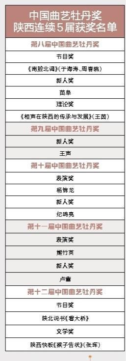 中国曲艺牡丹奖是由中国文联、中国曲协每两年举办一次的国家级曲艺最高奖。自2014年起,陕西省已连续5届获得中国曲艺牡丹奖,获奖作品涵盖了牡丹奖全部奖项。