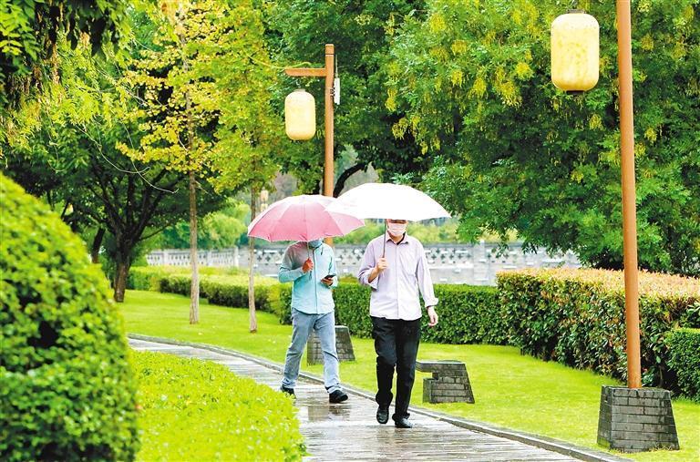 9月19日,绵绵秋雨让古城西安别有一番韵味。图为市民漫步在细雨中。(记者 尚洪涛 摄)