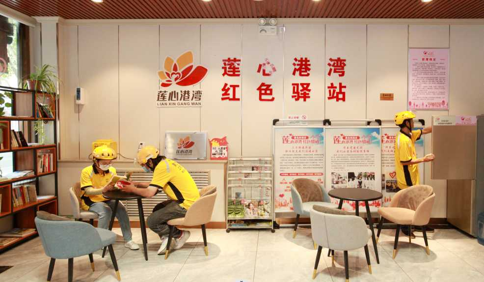 在离钟楼不远的青年路街道唐圣阁酒店,干净整洁的大堂内外,饮水机、微波炉、桌椅、充电设备、急救箱、雨伞、打气筒、消毒酒精、口罩等生活用品一应俱全,摆放得井然有序,路上来往的快递小哥和行人都可以免费使用这些物品,正面墙上红色的“莲心港湾 红色驿站”几个大字让人倍感温暖、踏实。
