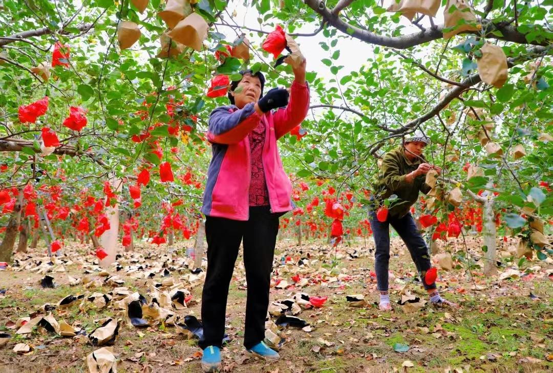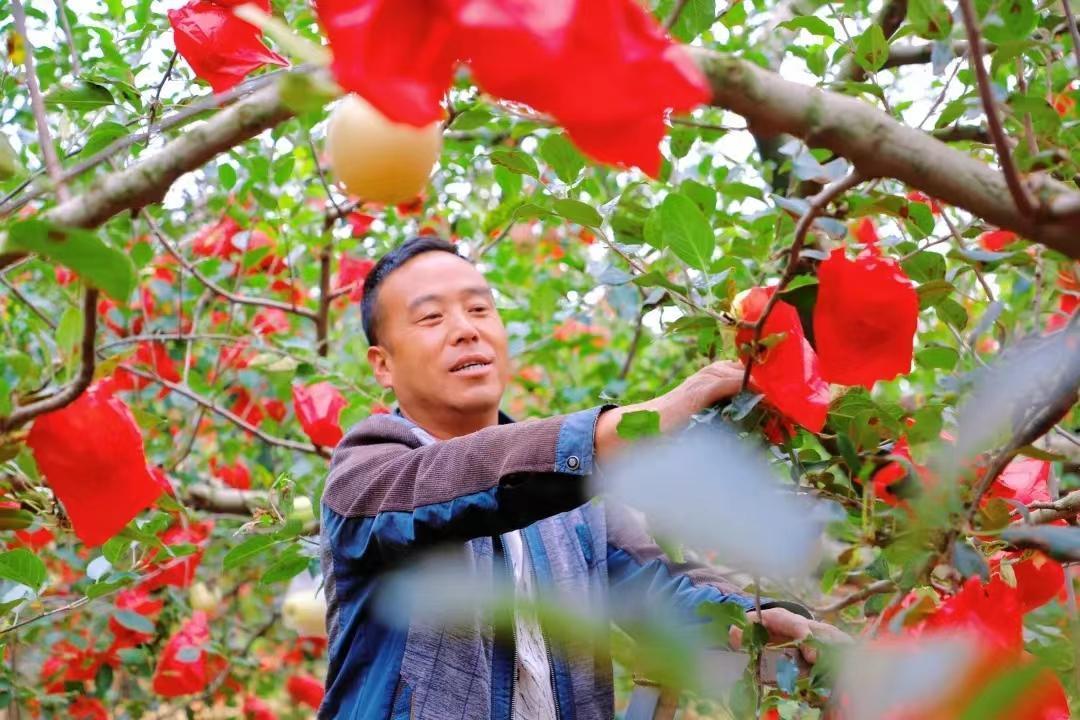 在黄堡镇丰兴果业合作社200亩矮砧苹果示范园,负责人郭满红正戴着草帽蹬着梯子给苹果摘袋,老郭兴奋地说:“我们村就是靠苹果富起来的,这两年果农重视了,舍得投入了,品质也提升了,我今年套了100多万个袋子,预计能产优质苹果30万斤,今年的苹果价格非常好,每斤订购价在3元以上,今年客商也比较多,早早就来订购了,我现在雇了十几个人正忙着摘袋,准备果子。”