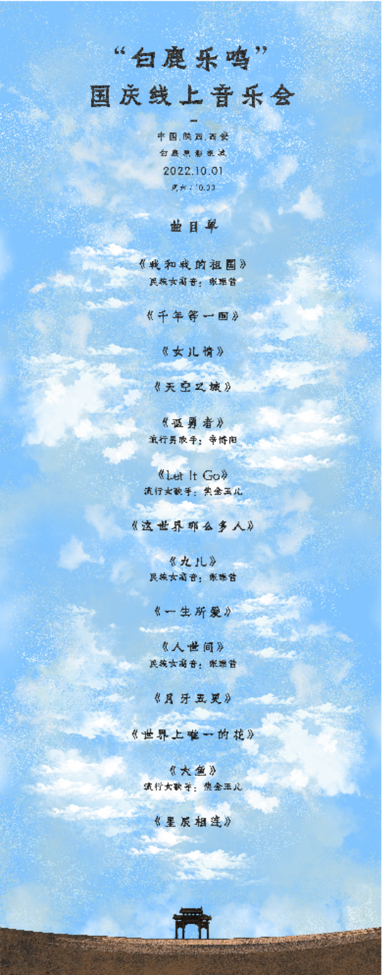 10月1日上午10点30分,“白鹿乐鸣”国庆线上音乐会将正式上线。本次音乐会由陕西省文化和旅游厅、陕西旅游集团有限公司、陕西省广播电视局、西安市文化和旅游局、蓝田县人民政府、陕西省旅游协会、陕西省旅游协会旅游演艺分会指导,陕西旅游集团朗德演艺有限公司、陕西白鹿原旅游文化发展有限公司、蓝田县文化和旅游体育局承办,陕西民族乐团、陕西省广播电视民族乐团倾情演绎。新华社、央视频、国际在线、陕西卫视、西安发布、西安文旅局、华商报、陕西交通广播、腾讯、新浪、网易、搜狐网、抖音、B站等平台将同步播出。