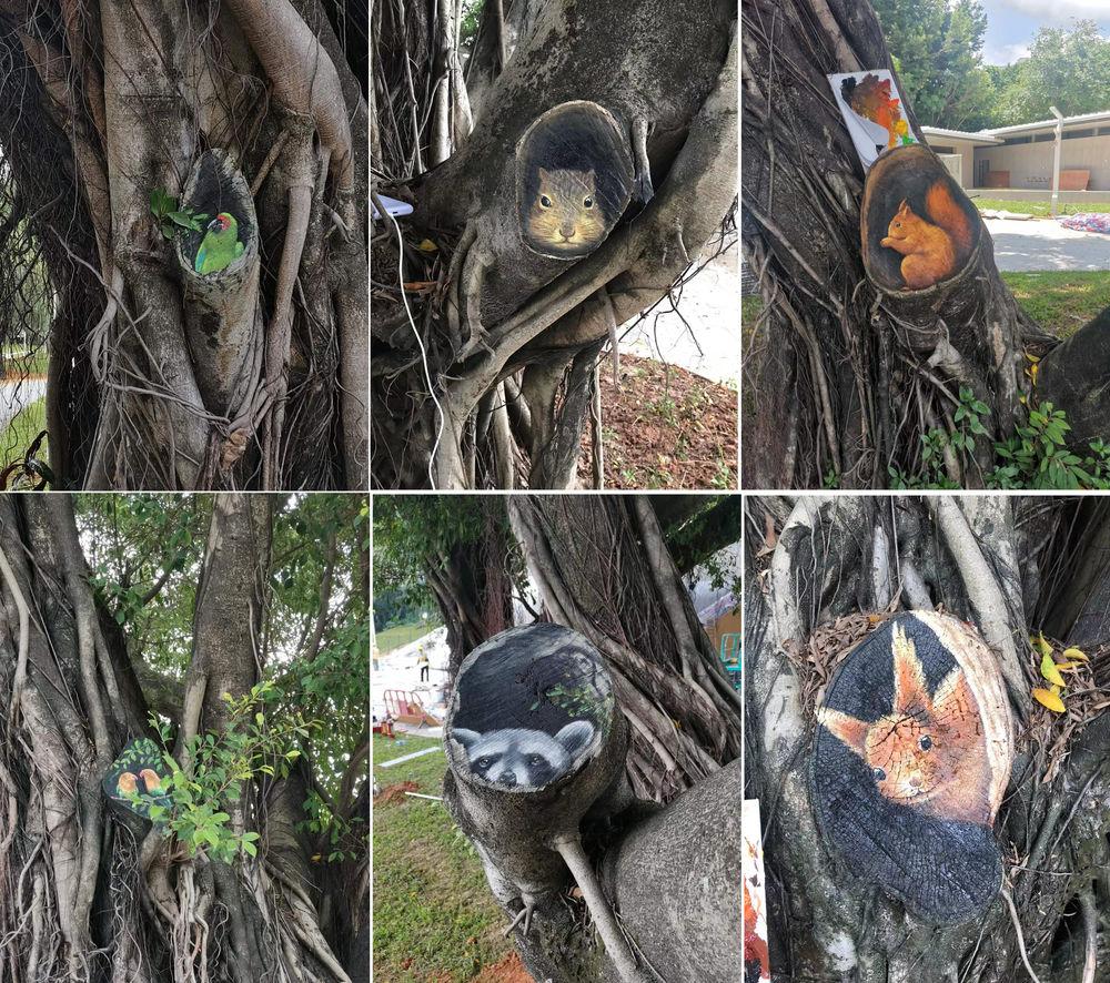 ↑李平在深圳莲花山公园等公园的电箱、井盖、树木上留下的部分绘画作品(拼版照片)。
