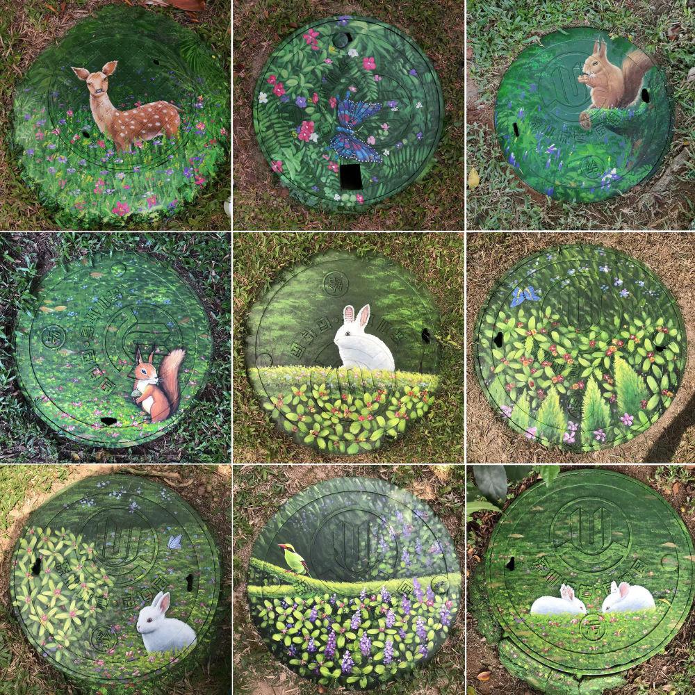 ↑李平在深圳园博园等公园的井盖上留下的部分绘画作品(拼版照片)。
