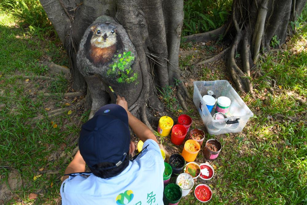 2019年,52岁的李平离开老家来到深圳应聘成为一名公园保安。看到公园里生了锈的井盖、突兀的各式电箱等等“瑕疵”,年轻时学过画画的李平萌生出了用画笔来美化的想法。