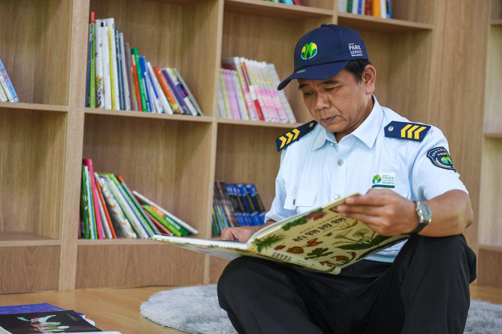↑10月9日,在深圳中心公园“风雨轩”书吧,李平在休息时间翻看动植物图集汲取灵感。