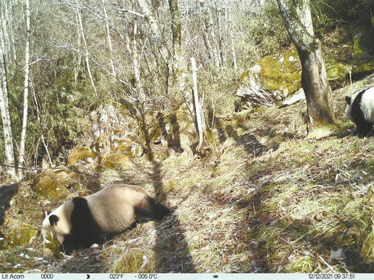 近日,陕西太白山国家级自然保护区管理局科研人员在整理红外相机影像资料时发现,布设在牛尾河区域大箭沟的1部红外相机,于去年12月12日拍摄到2只野生大熊猫一起活动的珍贵画面。根据大熊猫出现的季节、体型、毛色和行为等判断,这是一对野生大熊猫母子。视频中,大熊猫妈妈走在前面,而其孩子在后面顽皮地抓挠树干,啃咬树皮。