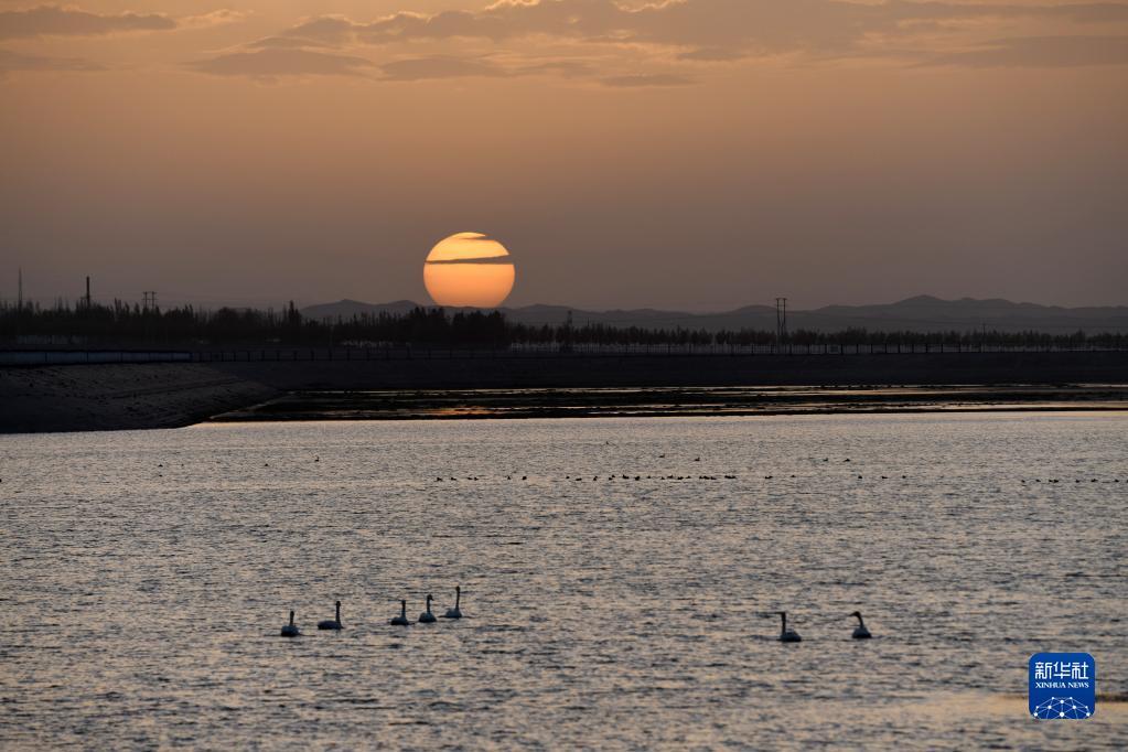 10月5日日落时分,在甘肃省阿克塞哈萨克族自治县的冬不拉水库,天鹅和野鸭在湖中戏水。