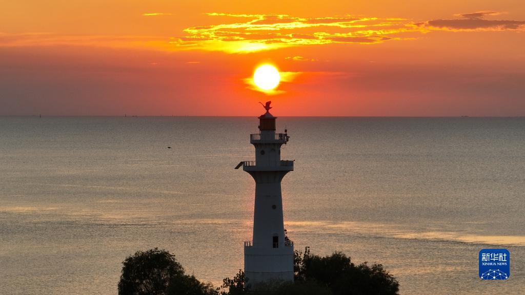 这是9月26日在江苏省淮安市拍摄的夕阳下的洪泽湖和灯塔(无人机照片)。