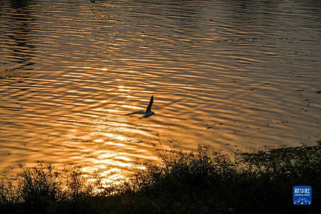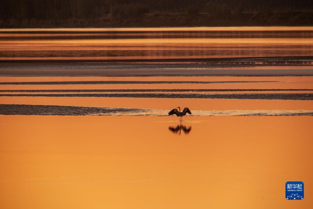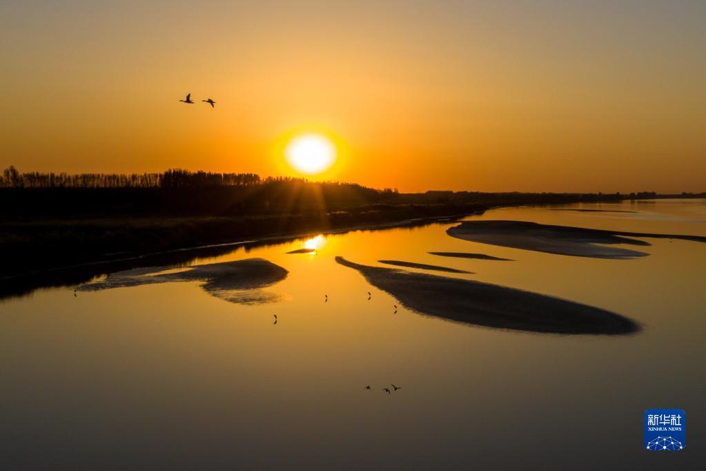 10月10日傍晚,水鸟在黄河下游山东高青段展翅欲飞。
