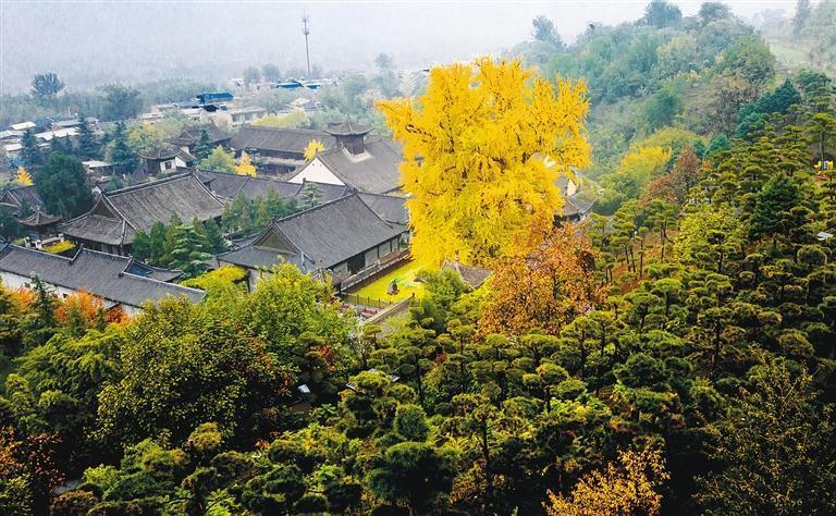 10月26日,终南山下古观音禅寺的千年银杏树披上“黄金甲”,满树黄叶,在青山的怀抱中格外显眼,蔚为壮观。