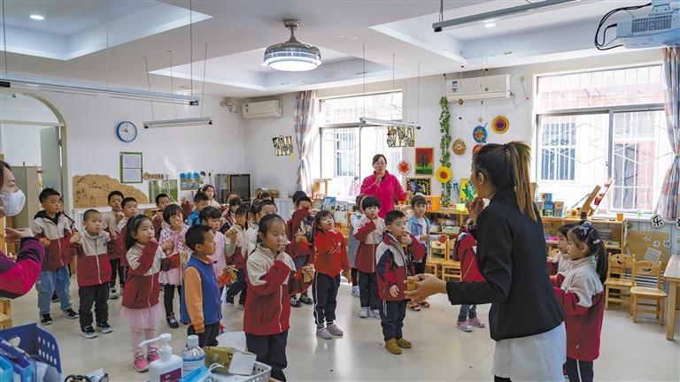 11月1日,竹韵斋陕西曲艺传承中心的工作人员在合作院校西安科技大学附属幼儿园授课。记者 王熙摄