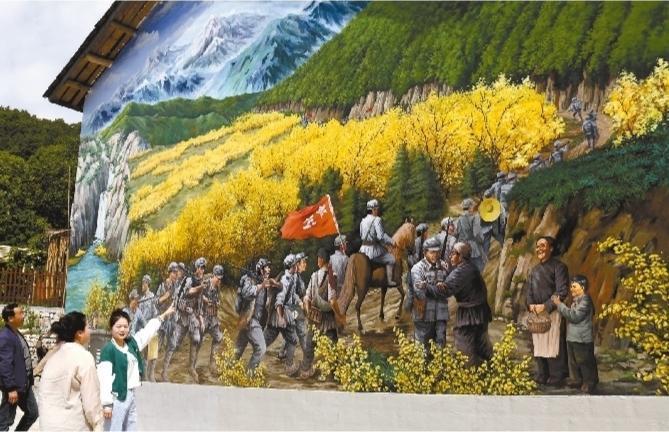 佛坪县长角坝镇沙窝村讲解员站在大型墙画前向游客讲述红军长征驻扎沙窝村的故事。 通讯员 吴彦峰摄