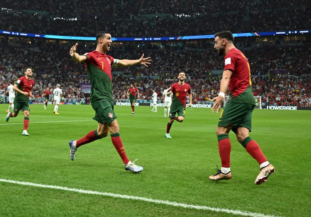 11月28日,葡萄牙队2:0战胜乌拉圭队,布鲁诺·费尔南德斯(右一)进球后和C罗(前左)庆祝。新华社记者 李尕 摄
