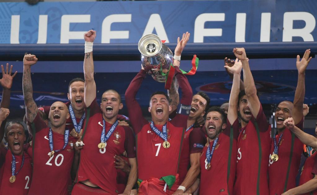 资料图:2016年7月10日,葡萄牙队以1:0击败东道主法国队,夺得欧洲足球锦标赛冠军。C罗(中)在颁奖仪式上高举奖杯。新华社记者 郭勇 摄