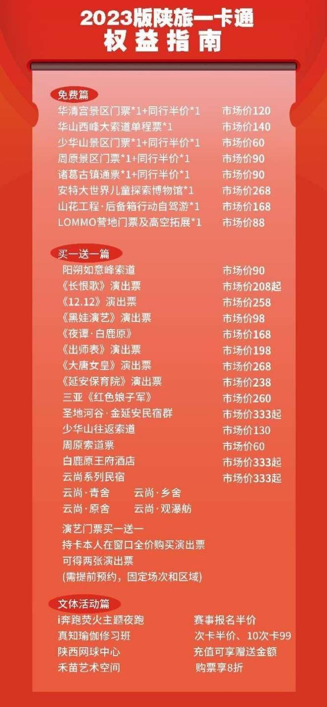 一卡通购买须知:“陕旅一卡通”购买成功后,在“陕旅嗨购”小程序的商城首页——我的——商品订单——查看您的一卡通激活码,复制激活码,然后点击“陕旅嗨GO”公众号下方“开卡预约”,进入“一卡通激活”页面,填写本人正确无误的姓名、电话、身份证号、验证码等信息后点击“立即激活”,即可获得一卡通的会员权益!此卡有效期至2023年12月31日前可使用,仅限本人使用,每个项目仅限体验一次,出行前需至少提前3日预约!免费门票凭预约短信换票入园,半价类凭预订短信现场购票。