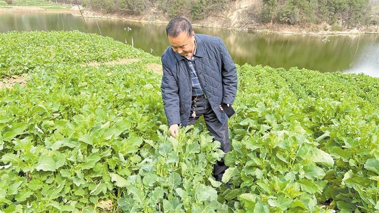 3月1日,周应军在汉中市南郑区的制种田查看油菜生长情况。 记者 赵茁轶摄