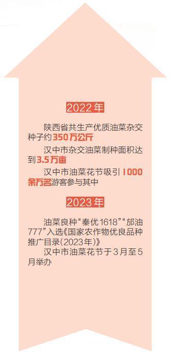 陕西是杂交油菜种业强省,杂交油菜育种研究和产业化开发一直走在全国前列。2022年,陕西省制定《油菜产业绿色革命科技三年行动实施方案》,取得明显成效。陕西省去年全年共生产优质油菜杂交种子约350万公斤。勉县、城固县、洋县入选全国油菜产业绿色革命科技示范县;陕西农业科研单位培育的油菜良种“秦优1618”“邡油777”入选2022年国家粮油生产主导品种和《国家农作物优良品种推广目录(2023年)》;汉中市农业农村局启动粮油“百千万”丰产示范工程,在全市11个县(区)建立油菜优良品种和绿色高产高效生产技术百亩示范点56个8100亩、千亩示范片23个2.9万亩、万亩示范带9个10.5万亩;汉中市南郑区和勉县被农业农村部认定为国家级油菜制种大县。汉中市委、市政府提出“最强产业、最优种业、最美花海”的发展战略,以“花”为媒,将汉中市油菜花节打造成推动乡村振兴和发展文化旅游的重要载体。2022年,1000余万名游客前来观光旅游或参与线上活动。“油菜经济”堪称陕西的一张金色名片。