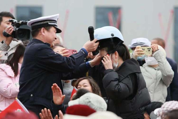 在“交通安全知识有奖问答”环节,通过与现场群众互动,向参与活动群众赠送安全头盔,并动员大家摒弃交通陋习,提升交通安全意识、文明意识、法治意识,营造共建共治共享的良好道路交通环境。