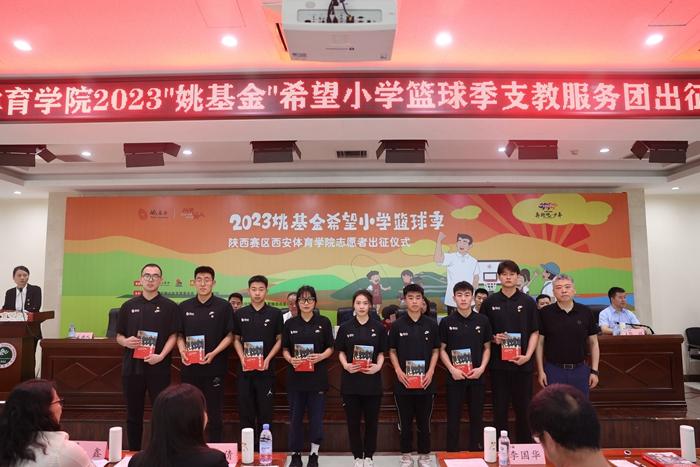 5月16日,西安体育学院2023“姚基金”希望小学篮球季支教志愿者出征仪式举行。来自运动训练学院、体育教育学院的33名在校学生组成的志愿者队伍,将前往渭南、延安、重庆等地,深入校园开展篮球支教活动。