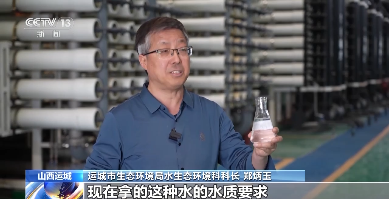 山西省运城市生态环境局水生态环境科科长 郑炳玉:这些水现在再经过进一步处理,也就是经过我身后这些设备,经过超滤反应的处理以后,就达到我手里面现在拿的这种水的水质要求,这个水目前就达到地表水Ⅱ类水标准。