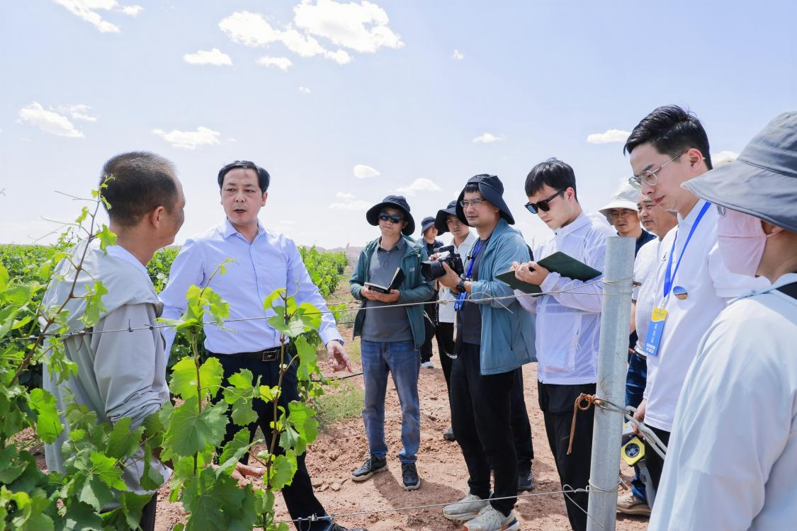 因毗邻黄河流域,与法国波尔多同属一个纬度,宁夏贺兰山东麓成为国产葡萄酒基地的后起之秀。6月19日,走出杨凌看示范新闻采访团一行驱车来到西鸽酒庄所在的“贺兰山万亩葡萄示范园”。