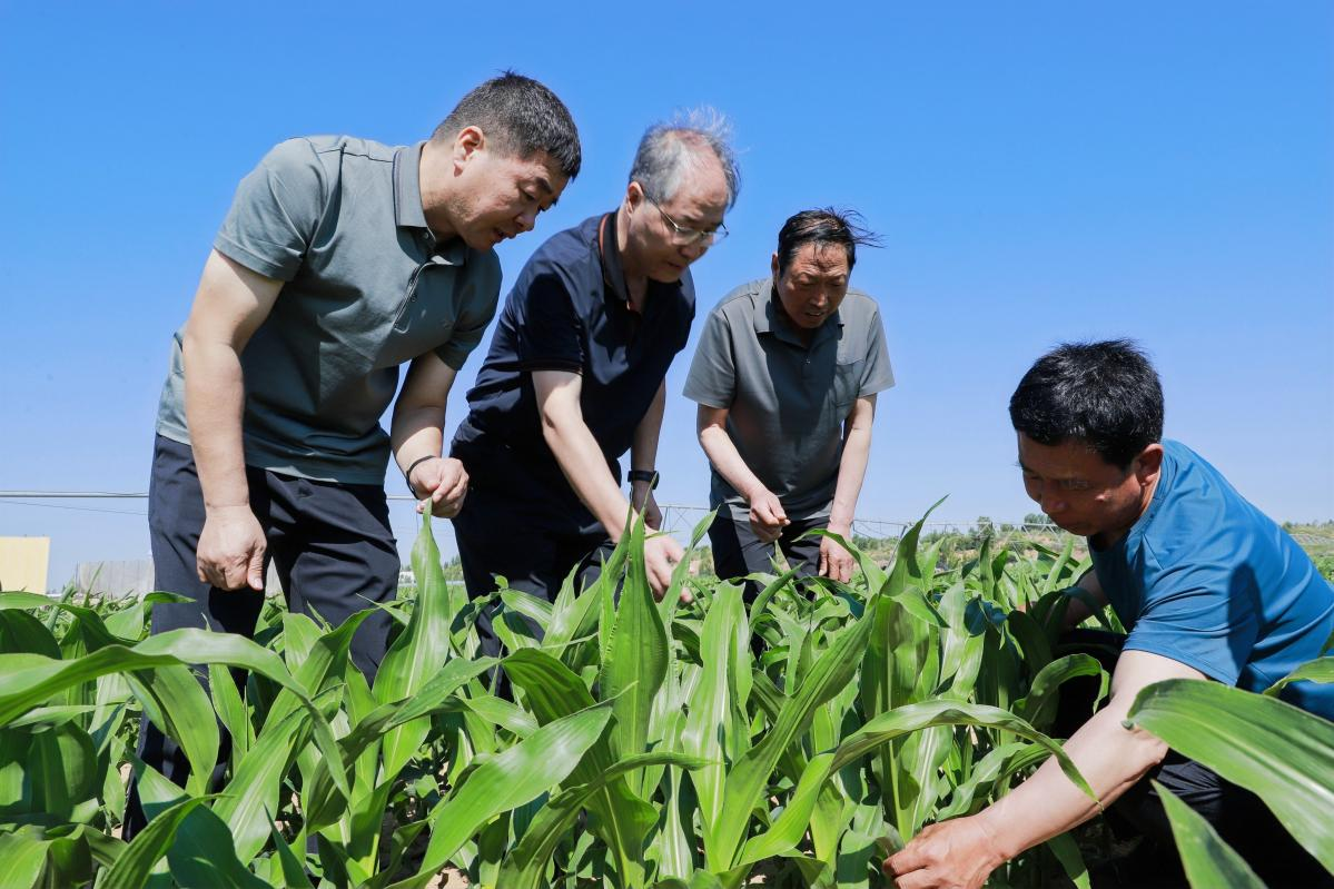 薛吉全教授(左二)查看玉米新品种长势