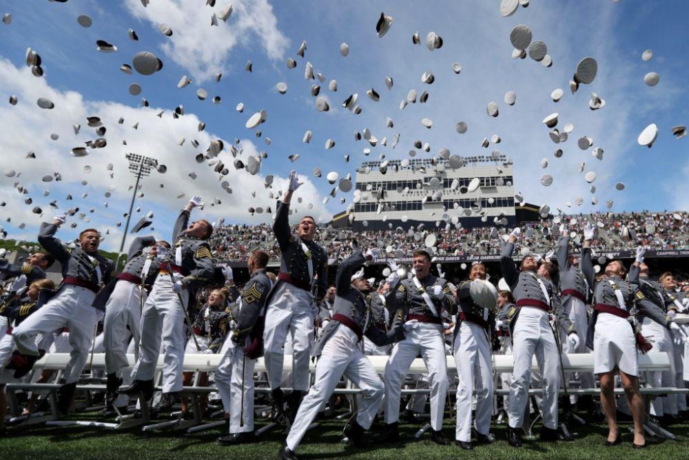 2017年5月27日,在位于美国纽约州北部的西点军校,学员将帽子扔向空中庆祝毕业。新华社记者王迎摄