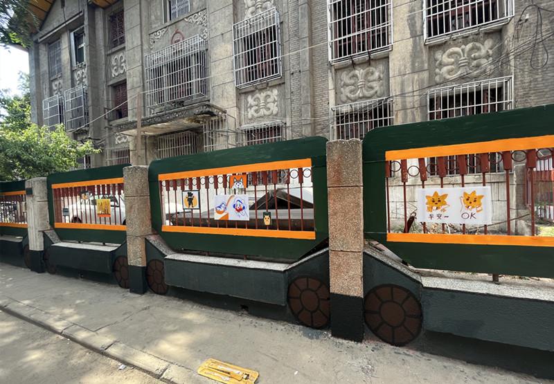 走进坤中巷主入口,一排火车车厢造型的小区栅栏吸引了大家的目光。“前期我们组跟附近小区的居民经过沟通和完善方案后才着手进行改造。”据西安交大学生冯周介绍,他们选取了火车车厢作为小区围栏的造型,以墨绿色作为主基调,跟小区窗户上的铁路标识相统一,形成统一规整的美感。这样既强调美化功能,又能传承与展示铁路文化特色。此外,搭配一些手绘元素图案,更加俏皮可爱。经过粉刷、设计,小区的围栏摇身变成了一列绿皮火车从小巷内穿梭而过。