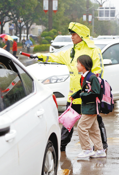 雨情就是警情。连日来,渭南公安交警以雨为令,全警上路,全力以赴,除隐患、防事故、保安全、保畅通。图为民警雨中护学。 通讯员 张亮 摄