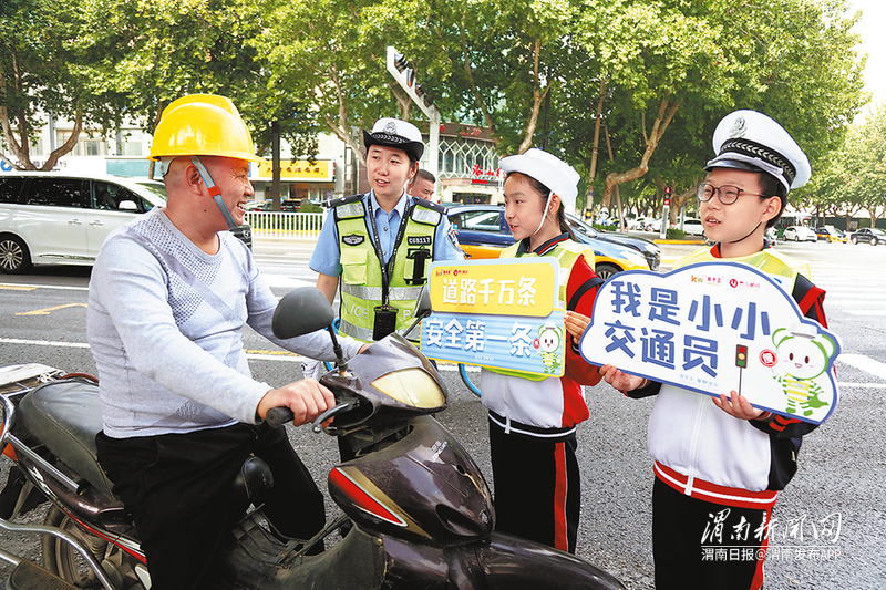 9月21日,市公安局交警支队临渭大队组织贠张小学学生开展“我是小小交通员”活动,劝导电动车骑乘人员规范佩戴安全头盔。通讯员 张亮 摄