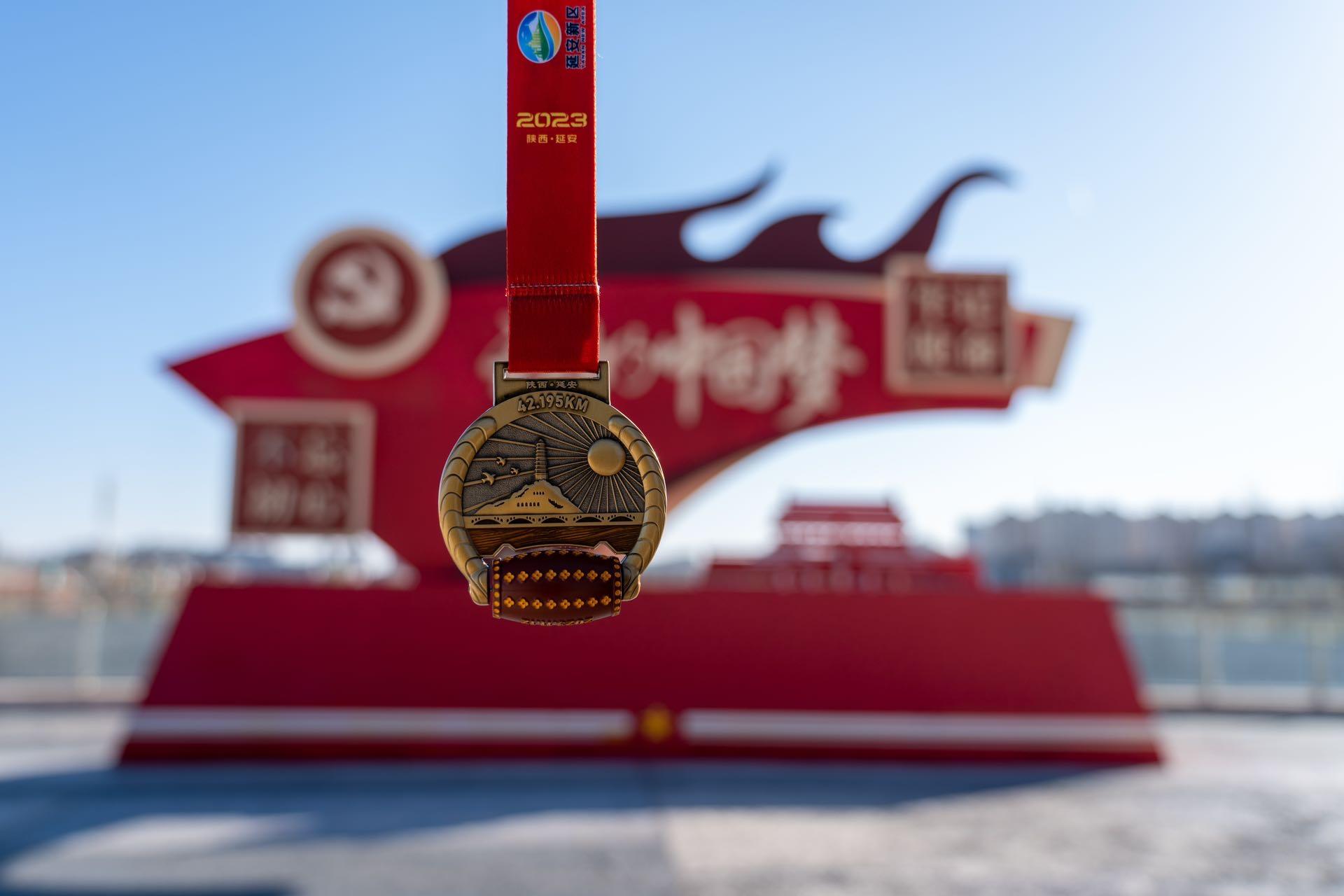 本次赛事完赛奖牌融入延安传统文化和风土人情。奖牌以延安新区logo和代表性建筑进行镶嵌,四周叠加的山体向上延伸出赛事主题。(记者 李知愚)