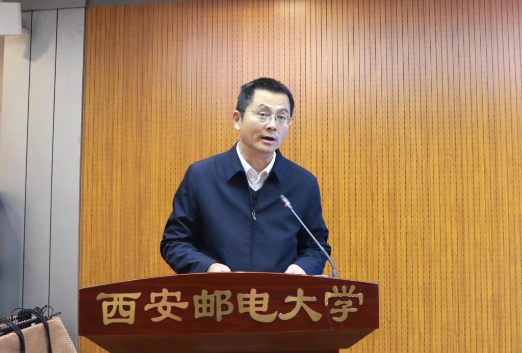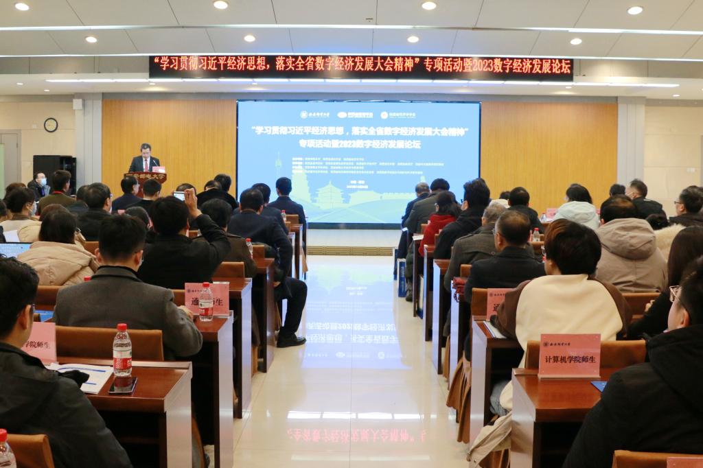 12月26日,“学习贯彻习近平经济思想 落实全省数字经济发展大会精神”专项活动暨2023数字经济发展论坛在西安邮电大学长安校区成功举办。陕西省社科联主席甘晖,西安邮电大学党委书记马宁、校长卢光跃出席开幕式,副校长楼旭明主持开幕式,副校长巩红主持特邀报告环节。来自省直机关、高等院校、社科研究机构、企事业单位的专家学者及西安邮电大学教师、研究生代表100余人参加会议。