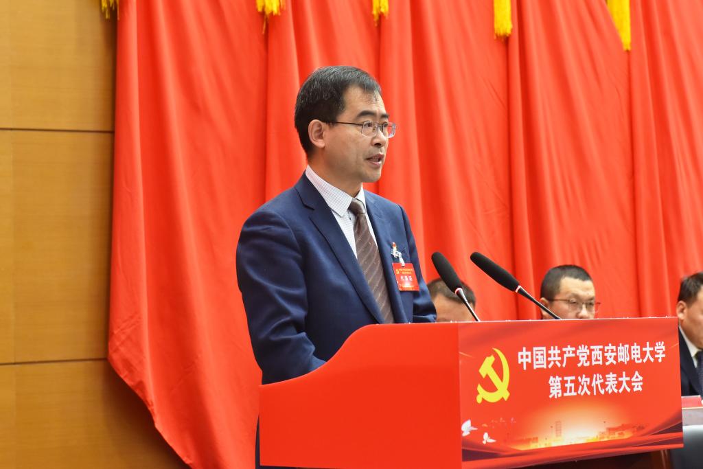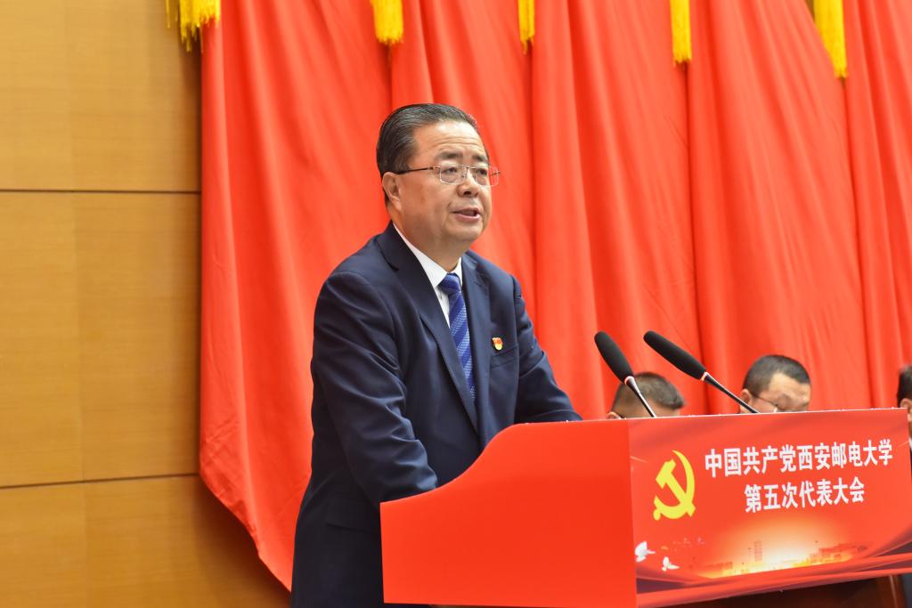 王海波代表省委教育工委、省教育厅向大会的召开表示热烈的祝贺,向全校共产党员和师生员工致以诚挚的问候。他指出,西安邮电大学是西北地区信息产业和现代邮政业人才的重要培养基地。在七十余年的办学历程里,学校始终坚持与国家民族同向同行、与邮电事业同频共振、与陕西经济社会发展同心同力,为国家邮电事业建设和区域经济社会发展作出了重要贡献。自第四次党代会以来,学校党委坚持以习近平新时代中国特色社会主义思想为指导,全面贯彻党的教育方针,认真落实立德树人根本任务,抢抓机遇,深化改革,以党建引领“双一流”建设,在教育教学、学科建设、科学研究等方面实现新的突破。这些成绩的取得,是全体共产党员和师生员工齐心协力、共同努力的结果,也是学校党政领导班子团结协作、真抓实干的结果。